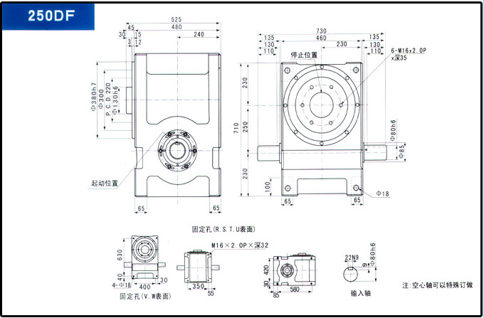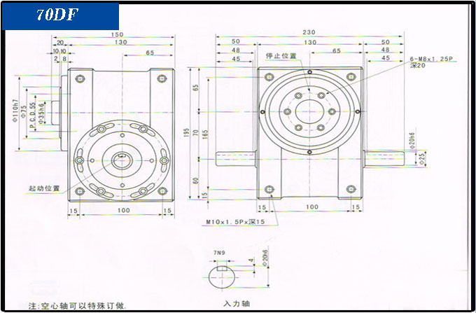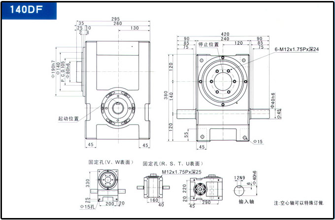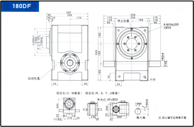 此机种具有重负荷特性、可承受较大的垂直径向或轴向压力,其输出轴为法兰盘式设计,有凸缘中心、盘面螺孔、定位、销孔、固定面宽大、可使链接件更具有坚实平稳。能适用于较大负荷的回转式圆盘驱动场合,别广泛使用在各类盘式加工机械及类似机构的产业机械,自动化间歇驱动部,驱动圆盘。